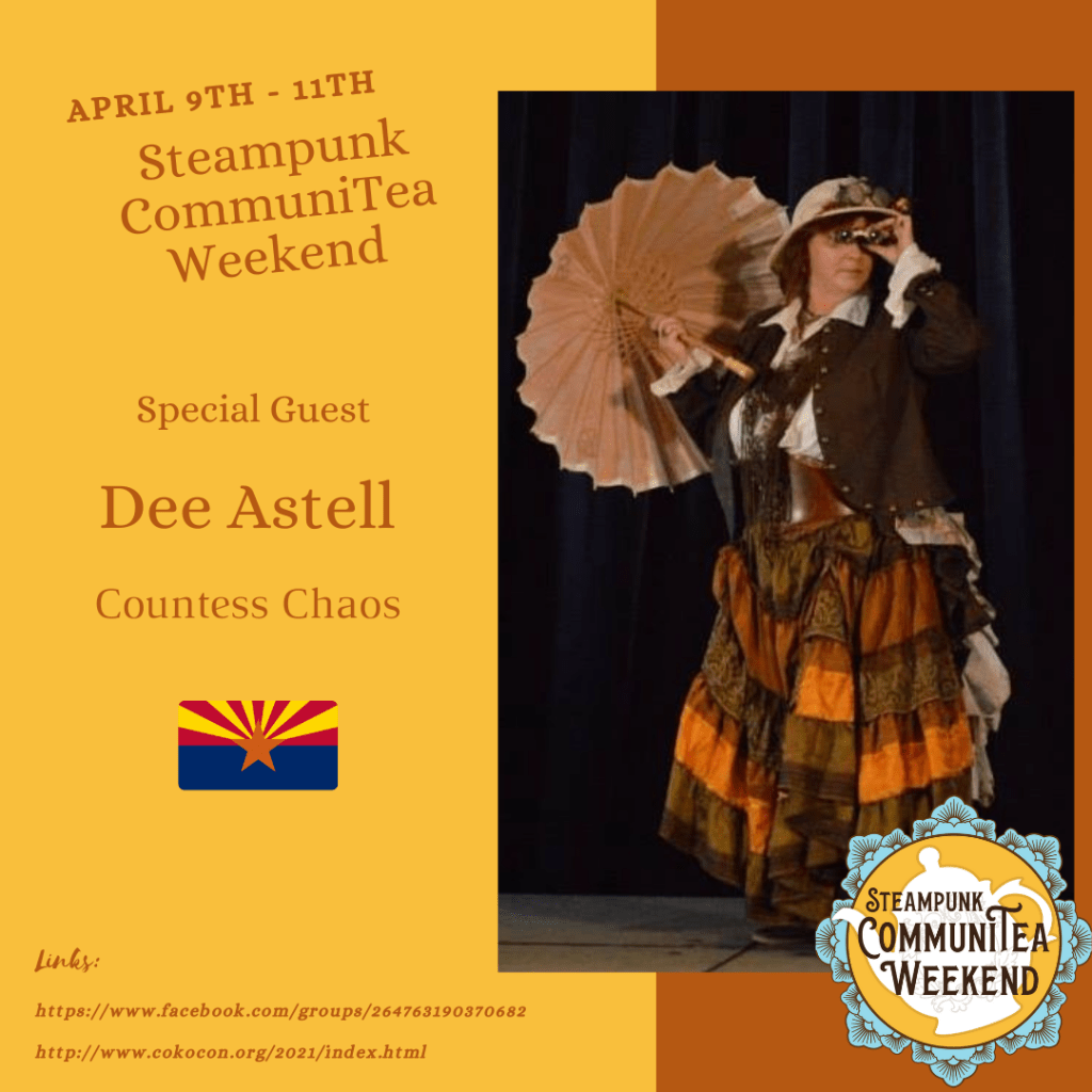 Dee Astell (Countess Chaos) is the chair of LepreCon 45 and the current chair of CoKoCon. Dee Chaired Westercon 70 and LepreCon 43 in 2017. She is the Fashion Manager for Wild Wild West Con. She’s held the title of Steampunk Event Coordinator/programmer for a variety of local conventions, as well as running a host of maker workshops in and out of Arizona.