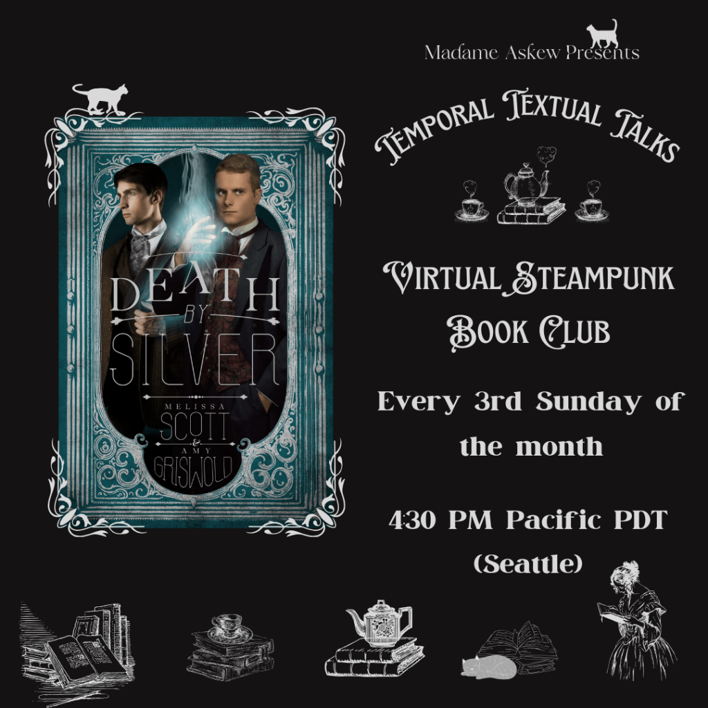 In just a few hours I am hosting our monthly virtual book club with dear Bill Bodden. We are discussing our charming pick this month, “Death by Silver” by Melissa Scott and Amy Griswold. I am smitten with this Gaslamp Fantasy, and I’m thrilled to be sitting down with all of you and our guests, Catherine Lundoff–publisher at Queen of Swords Press–and Melissa Scott. Bring questions for our guests about writing, publishing, and the book. This is also my happy reminder that you do not have to finish the book in order to attend but be prepared for potential spoilers.