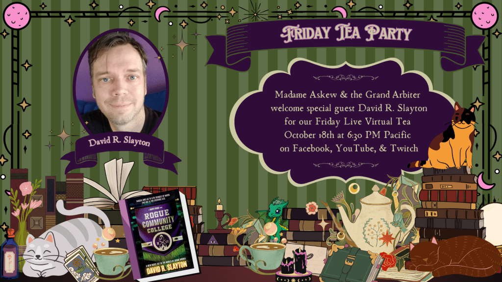 Fetch the bedknobs and broomsticks! David R. Slayton returns as our special guest for Friday Virtual Teatime just in time for spooky season! We’ll celebrate David’s latest release, Rogue Community College, and unleash some extra cheeky tomfoolery.