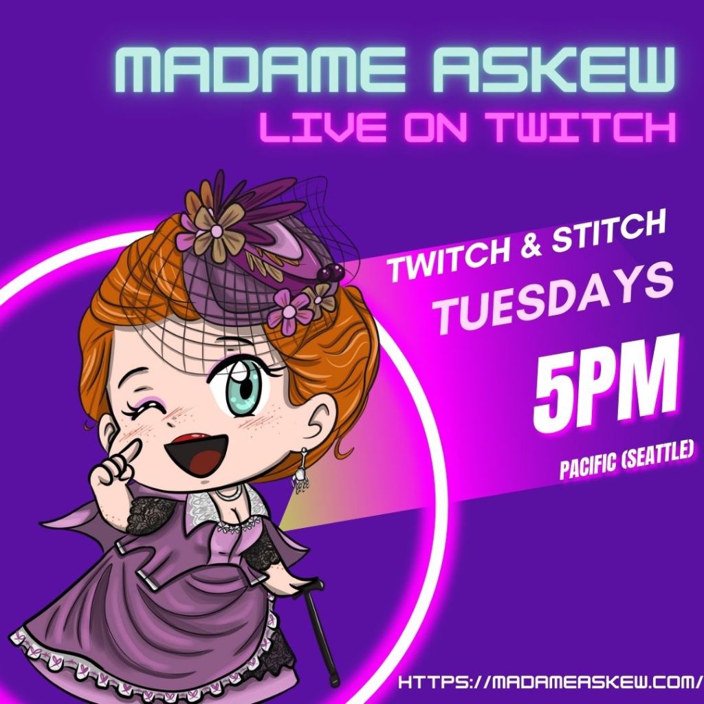 I am excited for our weekly Twitch and Stitch this evening at 5 PM Pacific (Seattle). I adore this regular opportunity to dish some sewing gossip, exchange recommendations for tools and techniques, and our moments of cheeky double entendre!