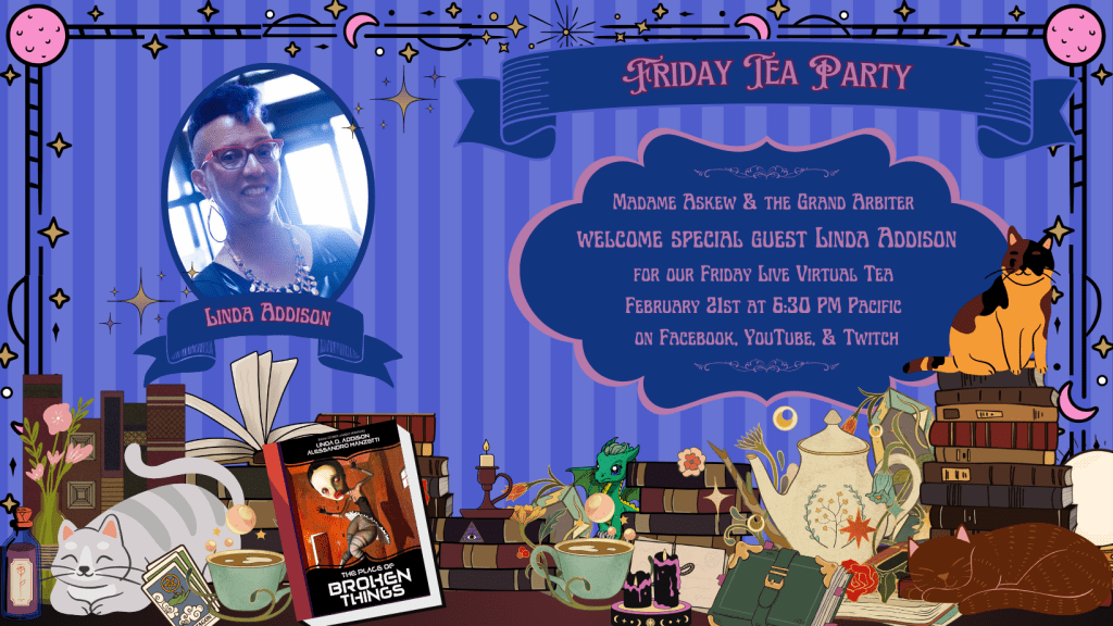 An hour is not remotely enough time to enjoy Ms Addison’s company, but I am delighted beyond words that we are able to welcome her for a guest even for an hour. Please join us this Friday, February 21st, at 6:30 PM Pacific for a marvelous conversation with our special guest. Catch us live on Facebook,YouTube, and Twitch. If you have not yet done so, please consider subscribing to our YouTube and following our Twitch for notifications.