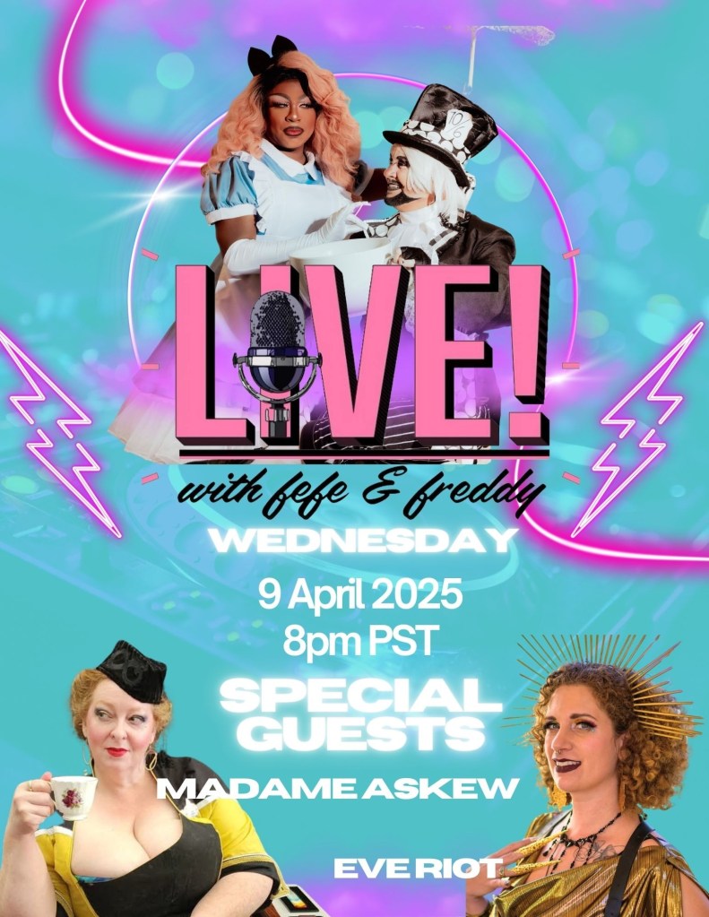 Tonight, April 9th, at 8PM Pacific, I have the delightful honour to join our dearest Eve Riot as a guest on Live with Fefe and Freddy. Freddy Prinze Charming, as many of you know, is the producer for the absolutely brilliant burlesque and drag show featured at Wild Wild West Con.