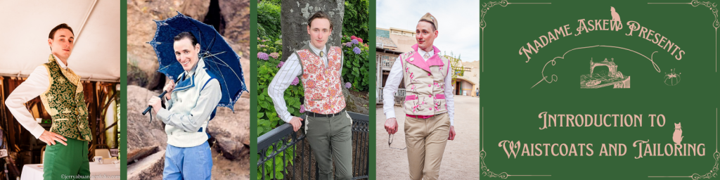Unleash the Dandy within and start your tailoring journey with Madame Askew in a community focused on support, kindness, and whimsy. Madame Askew will share her insight, techniques, and tips for creating a well fitted waistcoat with welt pockets for any gender presentation.