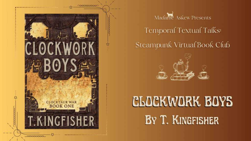 Time for another excellent summer read! Our July pick is a the fantasy meets steampunk gem, Clockwork Boys by T. Kingfisher. Get ready for a delightful rag-tag band of adventures facing off against deadly mechanical soldiers to save their city. They’ll use the power of snarky dialogue, clever tactics, and audacity to confront this clockwork menace! (If you love movies like the Dirty Dozen or the recent Dungeon’s and Dragon’s movie, this may be the perfect book for you!)