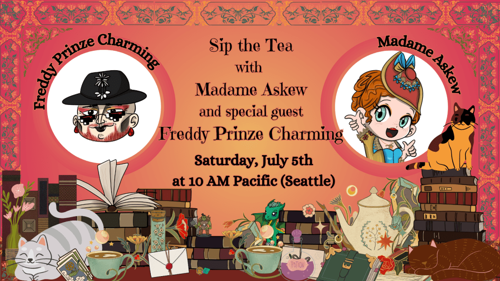 I am pleased as punch to welcome my dear friend, Freddy Prinze Charming to come Sip the Tea with me and dish all about making art, performing, nourishing community, and just keeping the drive to create alive in difficult times. Freddy is an incredible performer and producer. If you’ve enjoyed the Bourlesque and Drag Show at Wild Wild West Con, you’ve already seen Freddy in action, but you can also catch his work at Live with Fefe and Freddy.