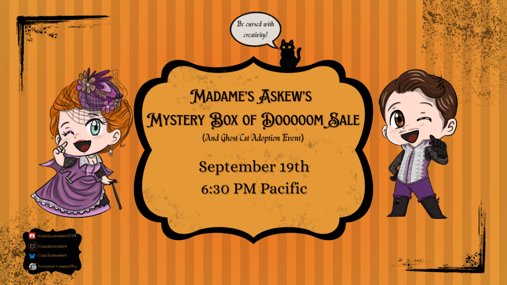 We are hosting the Mystery Box of Dooooom Sale on September 19th during our Friday virtual tea party at 6:30 PM Pacific (Seattle/Tucson). Each box will be available in “a first claimant wins the box” scenario so be ready to stake your claim for the box that strikes your fancy in the comments. The Grand Arbiter will be tracking names and doing his utmost to capture them as quickly as possible. If you claim a box second, you will be added to a backup list in case a winner chooses not to purchase their box.