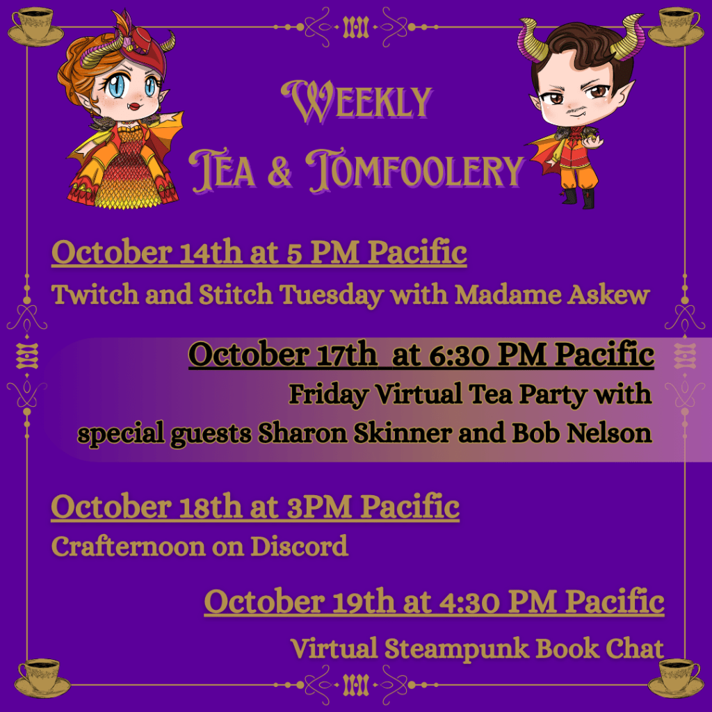 Friday, we welcome back wonderful author guest Sharon Skinner and the delightful Bob Nelson from Brick Cave Media for a lively Teatime adventure at 6:30 PM Pacific also on YouTube, Twitch, and Facebook.Saturday Crafternoon returns this weekend on Discord. Pop in anytime after 3PM Pacific for a couple of hours of co-working, community, and conversation. We always have a lovely time and it’s a great opportunity to meet our Discord CommuniTea!