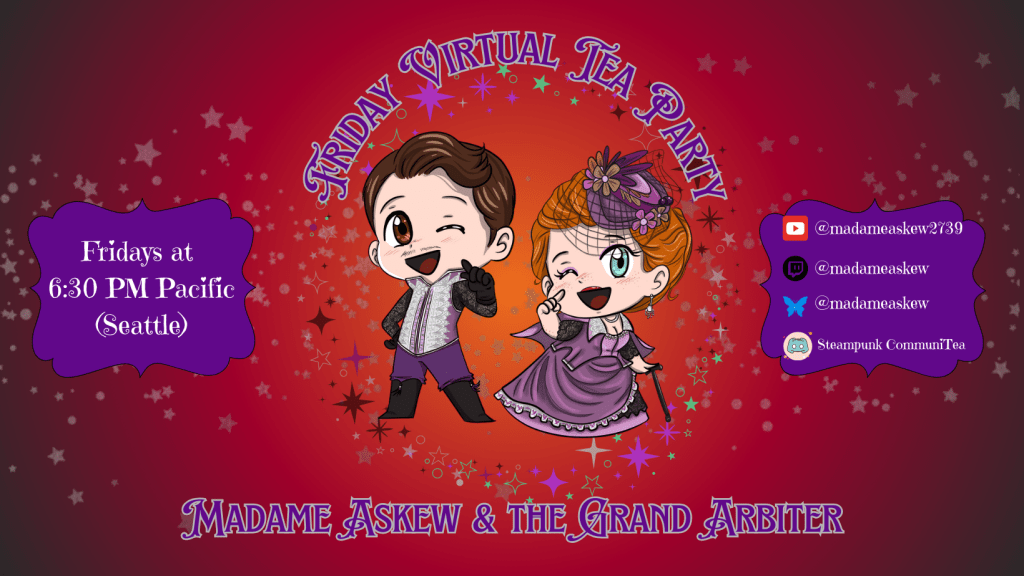 Friday tea starts at 6:30 PM Pacific (Seattle/Tucson)–9:30 PM Eastern (Montreal/Atlanta) and streams live on Facebook, YouTube, and Twitch. Please consider following us on YouTube and/or Twitch if you have not already. Facebook is increasingly a poor place for us to share our joy with you, my darlings.