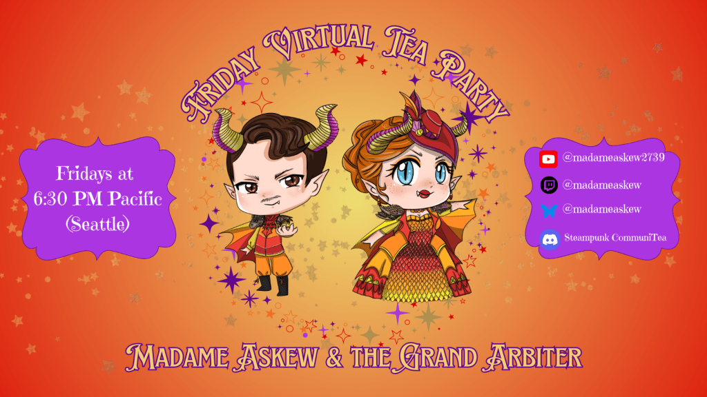 Friday tea starts at 6:30 PM Pacific (Seattle/Tucson)–8:30 PM Central (Madison)–9:30 PM Eastern (Montreal) and streams live on YouTube, Twitch, and Facebook. If you have not yet done so, please consider subscribing to our YouTube and following our Twitch for notifications.